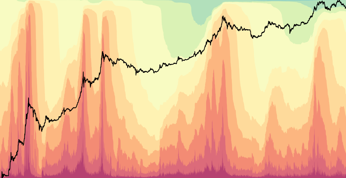 The color-coded price overlay tells the story visually. We've moved from the overheated reds and yellows of the cycle peak into the cooler blues and greens of a drawdown phase, but we haven't hit the deep blue of maximum opportunity yet.